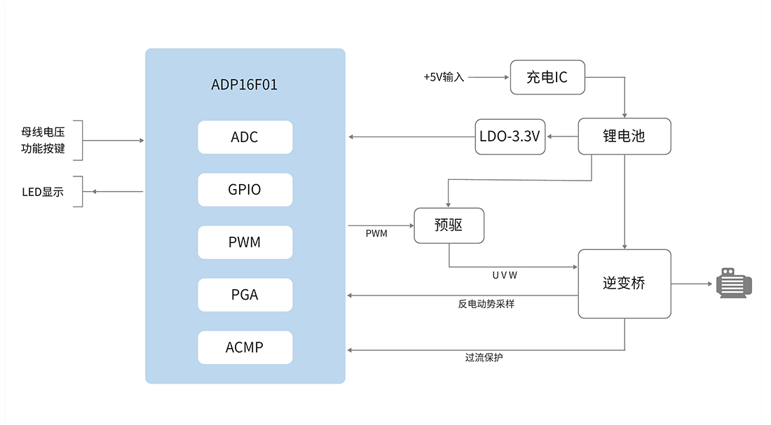本方案是基于進(jìn)芯16位DSP ADP16F01開發(fā)的,充分發(fā)揮了ADP16F01的算力、資源、成本等優(yōu)勢(shì)。整個(gè)系統(tǒng)結(jié)構(gòu)簡(jiǎn)單,采用無(wú)感方波控制算法,能夠?qū)崿F(xiàn)筋膜槍的穩(wěn)定啟動(dòng)和運(yùn)行,通過設(shè)置不同的限流點(diǎn)可以實(shí)現(xiàn)對(duì)的力道大小的調(diào)節(jié);擁有堵轉(zhuǎn)卸力,快速充電,動(dòng)力強(qiáng)勁等功能。