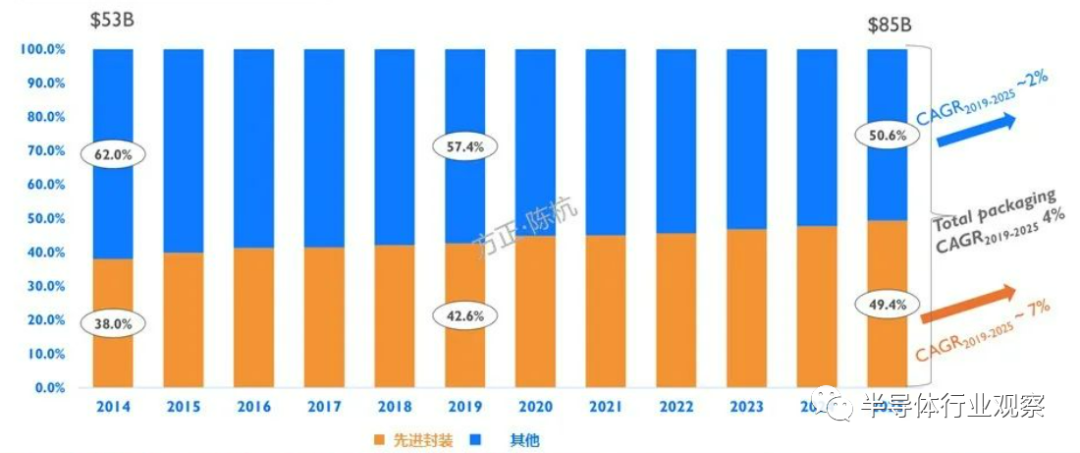 近年來在電子基板中,高密度多層基板占比越來越大,在先進封裝中的運用越來越廣泛。根據(jù)Yole數(shù)據(jù)顯示,全球封裝收入年復(fù)合增長率為4%,其中先進封裝市場的年復(fù)合增長率達(dá)7%,預(yù)計到2025年先進封裝收入將達(dá)到422億美元,封裝市場占比接近50%。