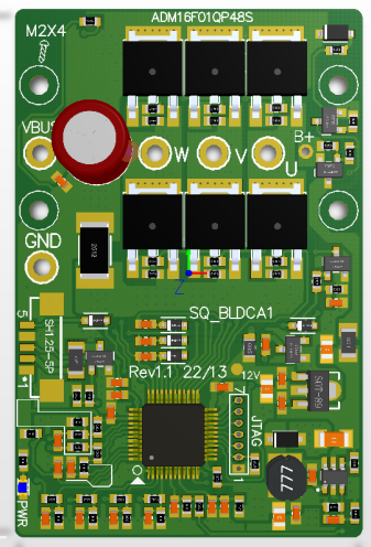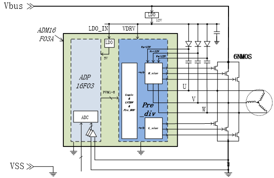 進(jìn)芯電子電動工具電機(jī)控制方案是基于16位定點(diǎn)DSP芯片ADM16F03A開發(fā)設(shè)計的,芯片主頻為100MHz,搭載延時濾波和運(yùn)算加速單元,內(nèi)置4K x 16 位 SARAM、(256+256+32)x16位DARAM、32Kx16位Flash,支持8路PWM輸出,SCI等豐富外設(shè)接口,內(nèi)部集成了6 NMOS Pre-Driver、運(yùn)算放大器、PGA、比較器、高速ADC等模塊,具有高整合度、高抗干擾、高可靠性的特點(diǎn),非常適用于BLDC/PMSM電機(jī)方波、FOC 驅(qū)動控制。