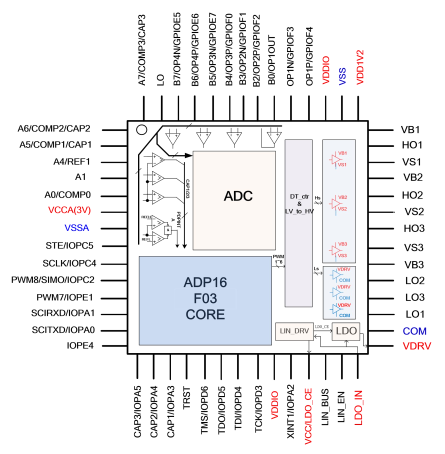 同時(shí), ADM16F03A2支持JTAG在線仿真,支持串口SCI方式的最低僅需四線的快速燒錄模式。以下為ADM16F03A2芯片引腳定義排布圖: