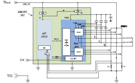 如以下框圖所示,集成的5V LDO和12V LDO可以將母線直接接入LDO_IN引腳,無需其他降壓、分壓器件;同時內置的6NMOS預驅動器只需要在外圍簡單配置boost器件即可使用;集成的LIN驅動器在需要與其他LIN主(從)機進行通信時,也可方便快捷的應用。結合我司自研的三半橋驅動兩相四線步進電機的軟硬件資源,可以實現用更少的芯片資源占用、更低成本的硬件來實現同樣優秀的步進電機控制。
