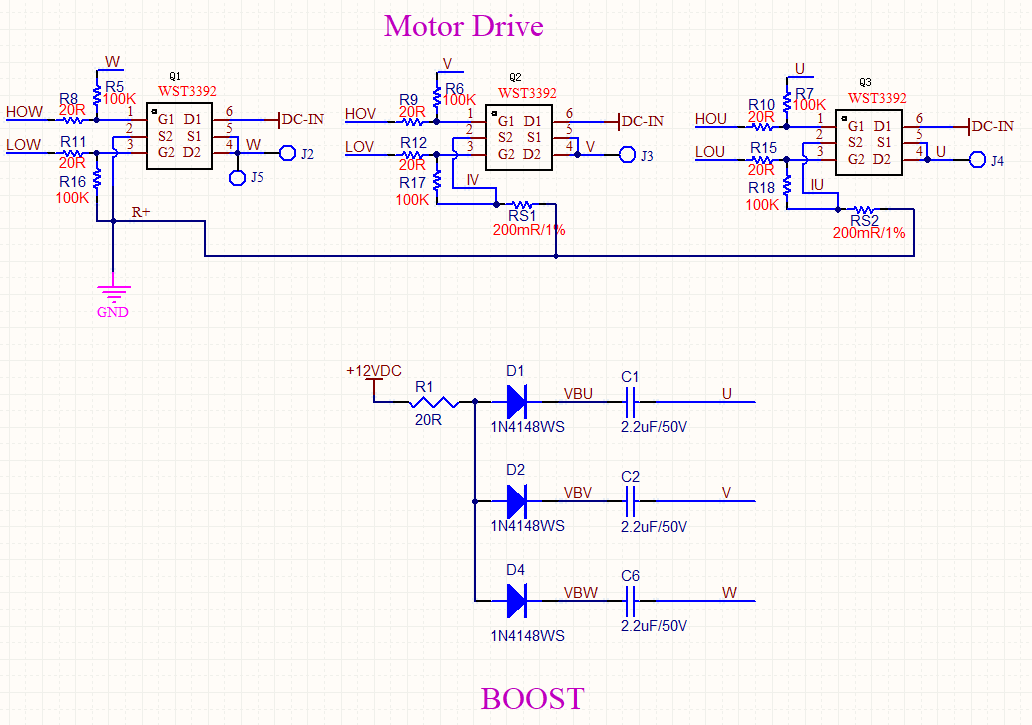 H橋電路采用上下管均為NMOS的配置,總計6個NMOS組成三相H半橋驅動電路。