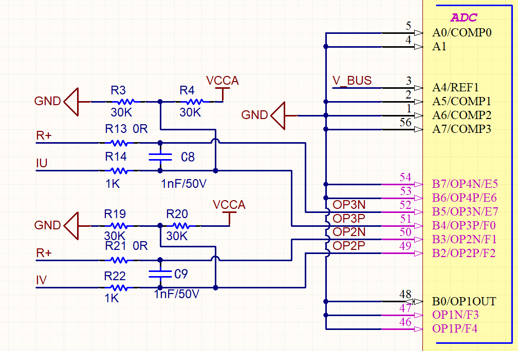 ADC采樣電路包括兩路橋臂相電流的采樣和母線電壓采樣。相線電流用于堵轉位置檢測 后續還可用于電流環 母線電壓檢測除用于保護外 還為軟件算法的計算提供電壓參數